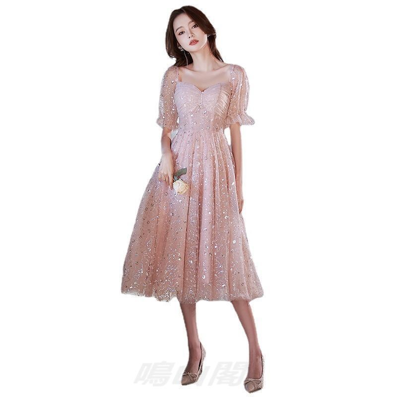 ピンクミディドレス レディースパーティー 在逃プリンセス風高腰Aライン礼服WP 109