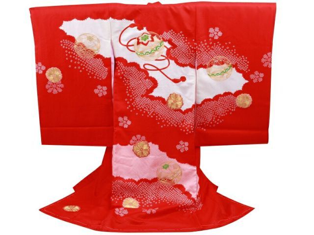 お宮参り 金駒刺繍入り 絞り柄 正絹 着物 長襦袢 セット 女児 女の子 子供 産着 祝着 赤系 紗綾型織柄 un-224
