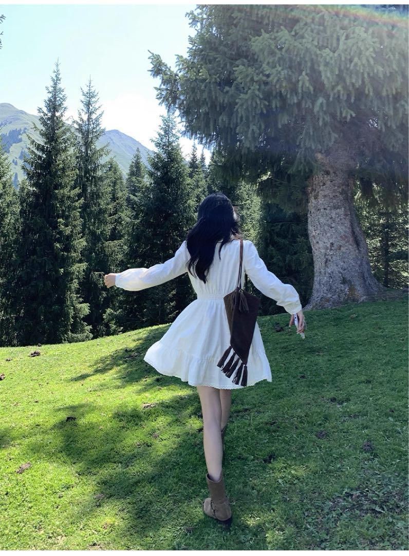 夏から秋のお出かけにぴったり!ひざ丈の韓国風ロングスリーブミニレースドレス。ウエストテクスチャが美しいこのワンピースで、女子会やデートをふわっと可愛く涼やかに。普段着としてもオシャレ感度高めです。