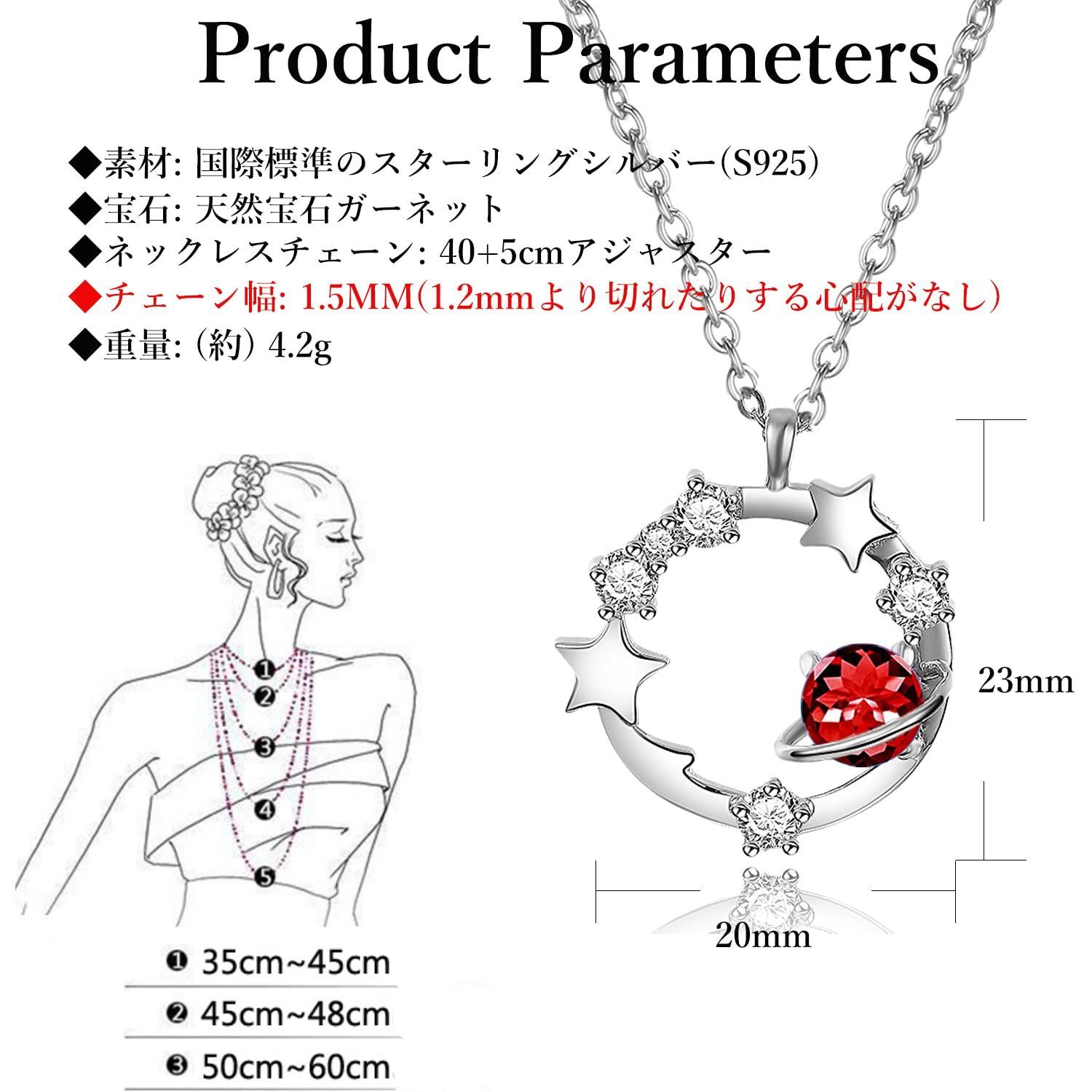 【惑星をモチーフにしているデザイン】お好きな人と宇宙を自由に旅するという理念を入れており、惑星シリーズが登場しました。夜空にきらきらに輝いているスター、ムーン、流星、惑星、どちらでも宇宙の魅力を話していますでしょう。目立っているガーネット誕生石を飾り付けているネックレスを首元につけると、ユニークで可愛らしくも大人っぽさも秘めたジュエリーアクセサリーです。