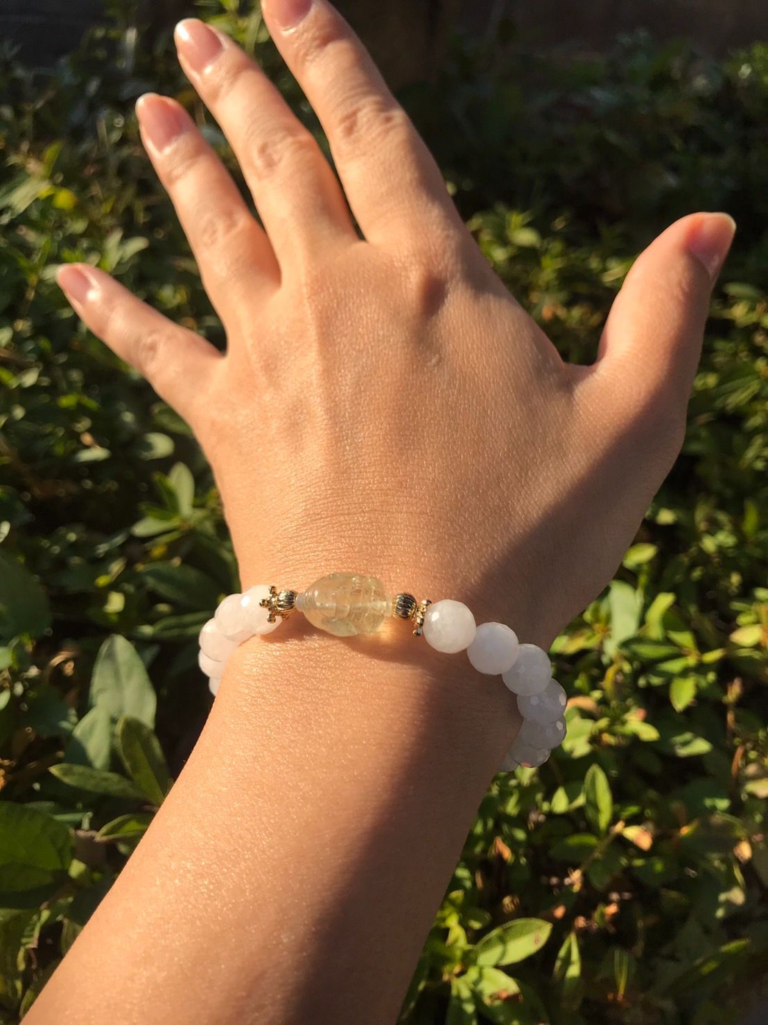 透明度の高い高品質リビアングラスのレアな手彫りガネーシャ神のビーズとスノーマニカラン水晶ミラーボールカットのデザインブレスレットです。