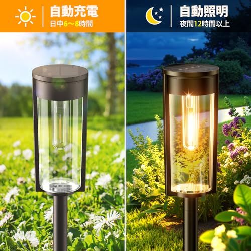 光と闇の美学:アップグレードされたガーデンライトとして、ソーラーパネルがより大きく、高変換率の単結晶シリコンソーラーパネルを使用し、変換効率最大25%。本ソーラーライトは透明なランプシェードデザインを採用して、光の透過率が向上です。最新の照明技術で、より明るいLEDフィラメントを採用して暖色で高輝度、ロマンチックで温かい雰囲気を演出します