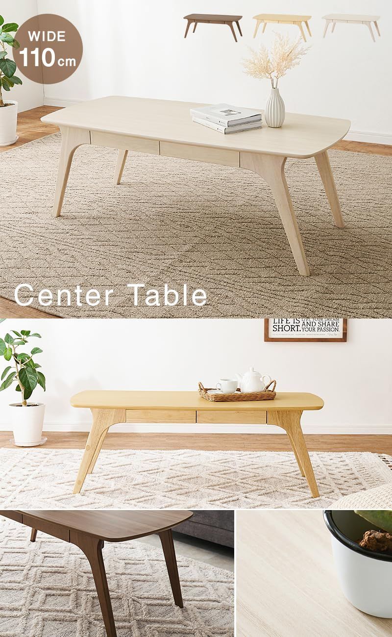 なめらかな曲線とスタイリッシュなシルエットにこだわった木目調のセンターテーブル。幅広で作業もしやすく、便利な引出し収納付き。