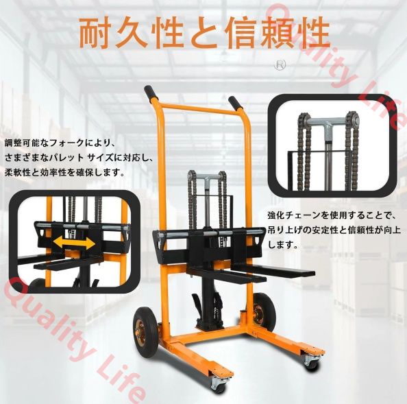 【高品質素材】ハンドフォークリフトは高品質のスチール。厚いスプレー塗装、工業グレードの素材フレームで作られており、耐久性と信頼性の高いパフォーマンスを保証します。また、滑り止めハンドルも備えており、操作中のグリップと安全性が向上します。