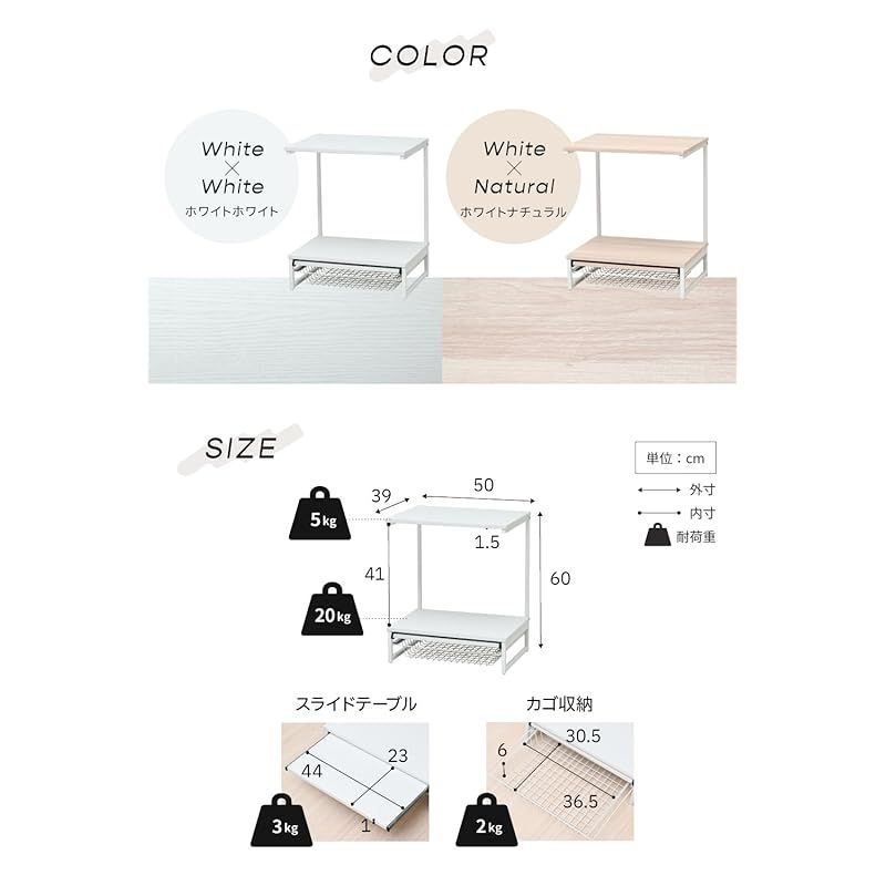 【サイズ】◆本体外寸:幅約50×奥行約39×高さ約60cm◆天板:幅約50×奥行約39cm◆メイン収納部:幅約50×奥行約37×高さ約41(最大43)cm◆スライドテーブル:幅約44×奥行約23×高さ約1cm◆カゴ収納:幅約36.5(最大40.5)×奥行約30.5(最大35)×高さ約6(最大8.5)cm