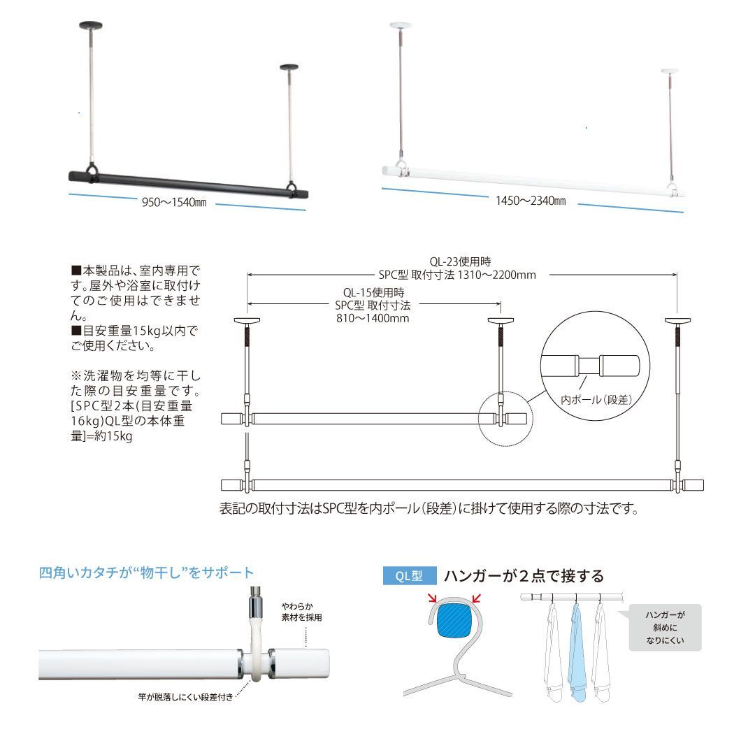 ・伸縮竿 QL-15-W:950〜1540mm対応、短めサイズで使いやすい