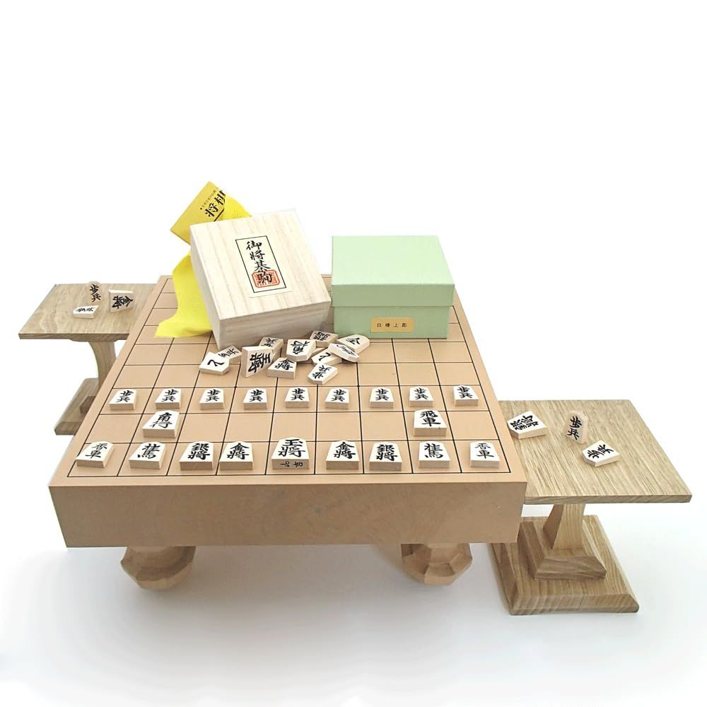 新桂(しんかつら)二寸足付将棋盤と白椿(しろつばき)上彫駒に栓(せん)二寸1本足駒台をセットして将棋三点セット
