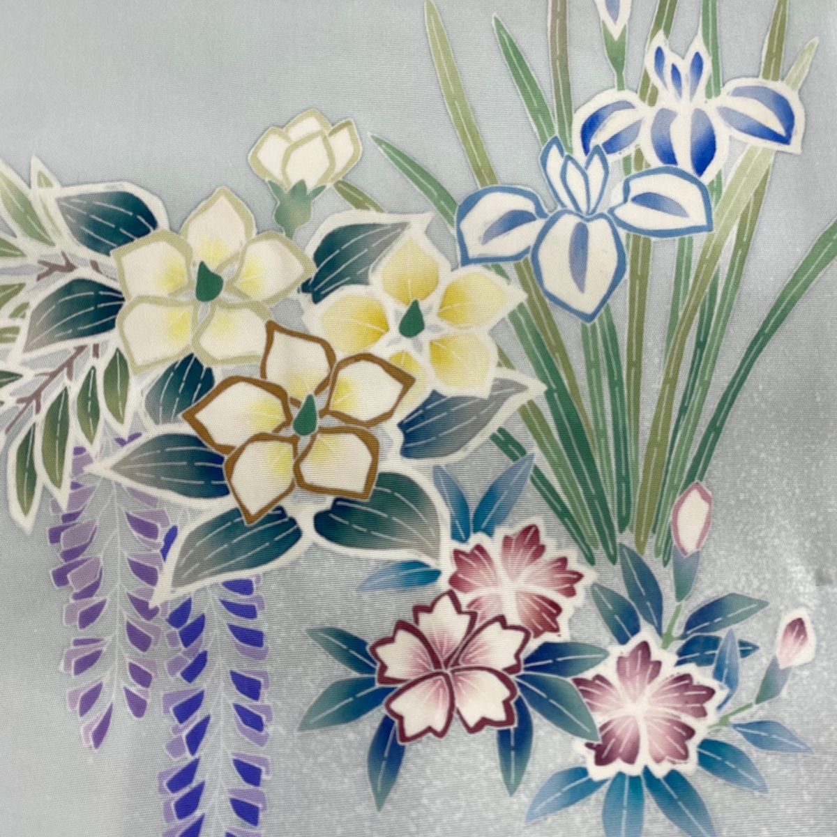 名古屋帯 秀品 落款 草花 菖蒲 ぼかし 青灰色 正絹