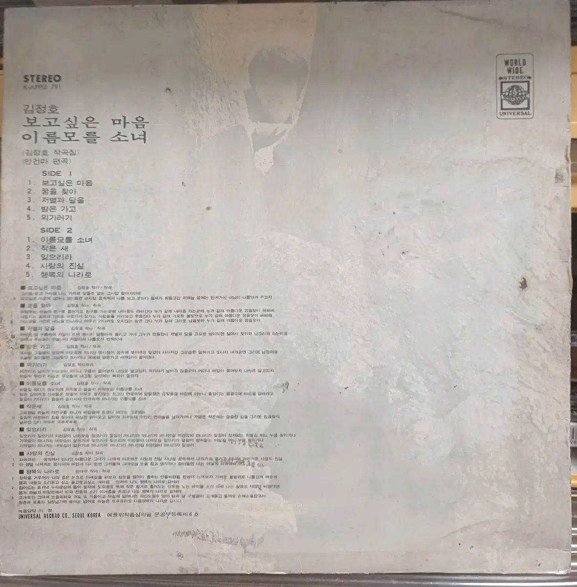 キム・ジョンホのファーストLPのファーストアルバムです。1974年にユニバーサルレコードからリリースされた珍しいアルバムです。EX+コンディションで、コレクター向け価値があります。他に質問がない場合は、すぐに安全な支払いを行ってください!