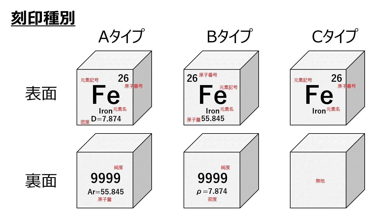 【識別】(表)[原子番号、元素記号、英名、密度]、(裏)[純度、原子量]