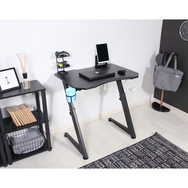 デスク下に格納できる「ヘッドフォンフック」と「ドリンクホルダー」付き。組み立てた時に左右どちらでも取り付けが可能です。お好みの位置に設置できるコントローラースタンド付き。様々なコントローラーを収納できます。お好みの位置に設置できるタブレットスタンド付き。画面の見やすさはもちろん、PCモニターに出力する際も便利です。天板の高さを59.5cmから3cm間隔で7段階の調整が可能。最大80.5cmまで上げて使うことができます。天板は幅80×奥行60cmでデスクトップも置ける十分な大きさ。勉強する際にも教科書とノートを一緒に広げることができます。配線用の切り欠き付きなので、コードを挟まず壁にべた付けできます。また、高さの微調整ができる調整脚付き。水平に設置することで、がたつきを防止します。