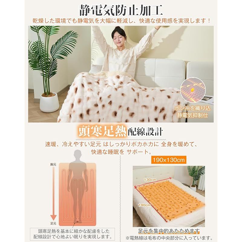 電気毛布 敷き 掛け敷き兼用 表面兎毛調 裏面コットン調 190 x 130 cm 特大サイズ ダニ退治 電気ブランケット 8段温度調節 1-10 Hタイマー付き 90 W 速暖 電気掛け毛布 ふわふわ 省エネ 過熱保護 防寒対策 洗濯機丸洗い 暖房器具 寝具