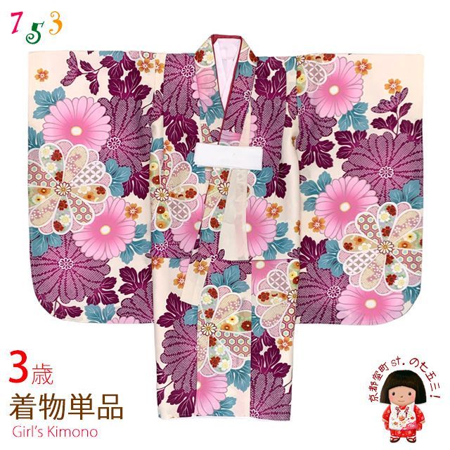 七五三 3歳 着物 女の子 身上げ 肩揚げ加工済み 襦袢付き 三つ身の着物 クリームx赤紫 菊 TY 3 K 12 tan