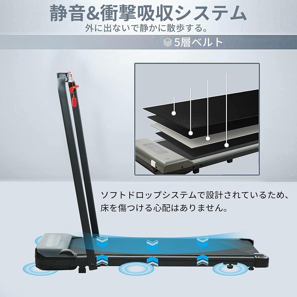 【高耐久&パワフルな走行】新世代デザインの特徴。広い走行面の内部にはゴムバンパーを装備し、足腰への負担を軽減します。完全なトレッドミルの衝撃吸収機能、非常に良い保護効果を再生するために床の衝撃面積は、床が傷つくことを心配しないでください。