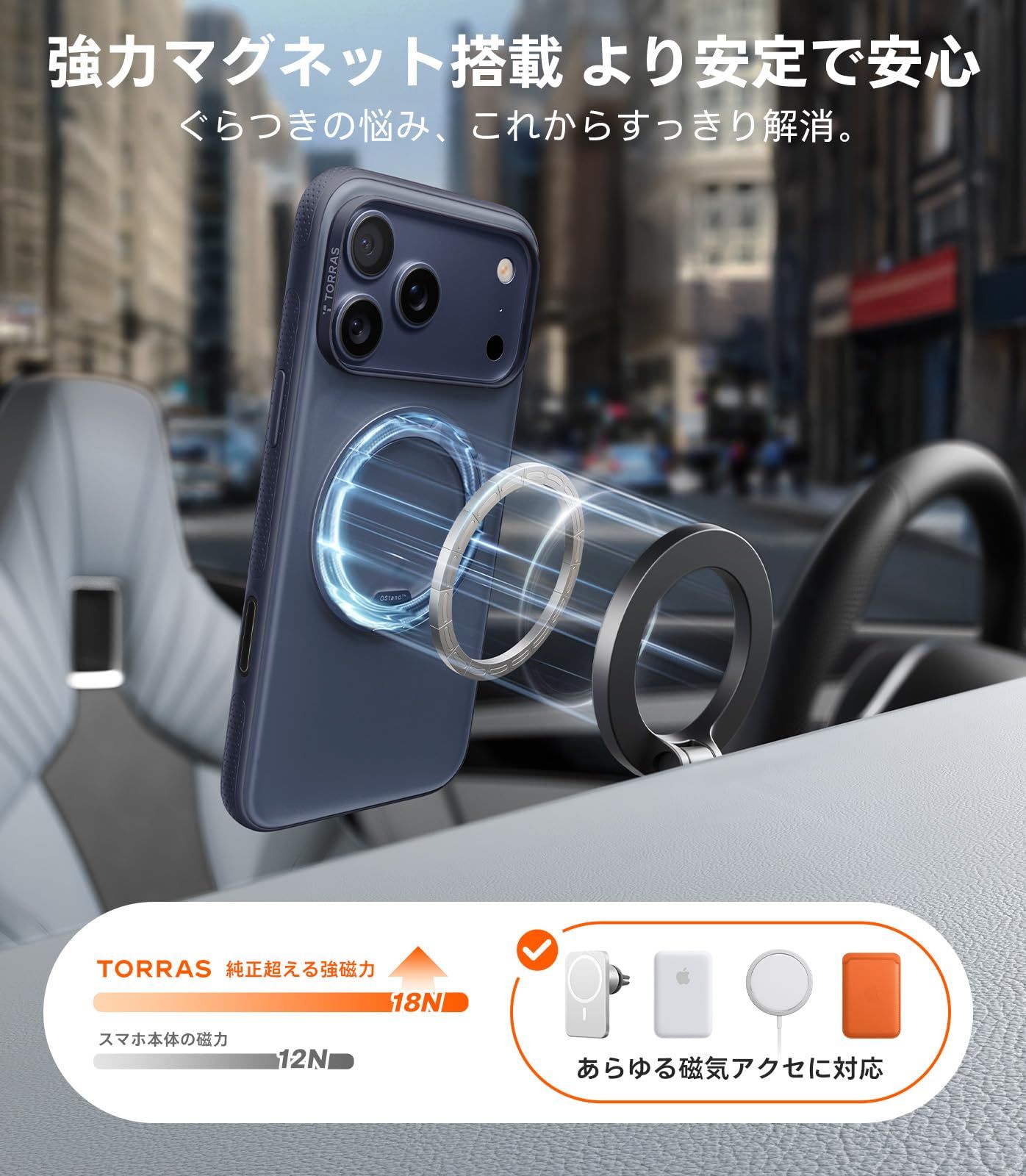 驚異の磁力MAX!36個の高性能N52磁石を採用し、MagSafeと同素材で作られています。さらに独自特許のHalbach Array技術により磁石の配置と磁力線の方向を最適化し、を超える吸着力を実現。スマホをしっかり固定するだけでなく、ワイヤレス充電効率も大幅アップします。対応機種:For iPhone 17 pro max ケース