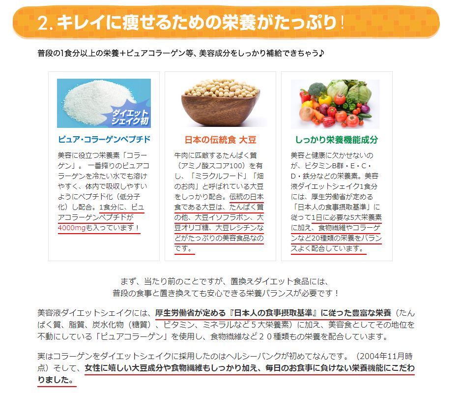 ②ゲッソリ痩せしない為に、厚生労働省基準の1食分のタンパク質、ビタミン、ミネラル、食物繊維をしっかり配合し、栄養補助食品としても使用できる程、栄養満点