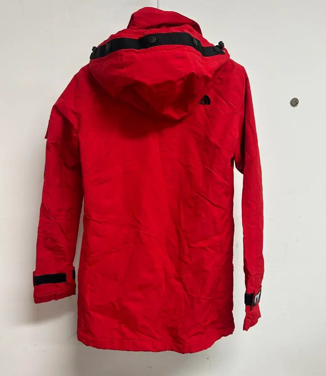 鮮やかな赤のTHE NORTH FACE ザノースフェイス レディースサン(SAN) ジャケットです。フード付きで、レディース80 サイズです。バスト部分にTHE NORTH FACE ザノースフェイス ロゴが入っています。