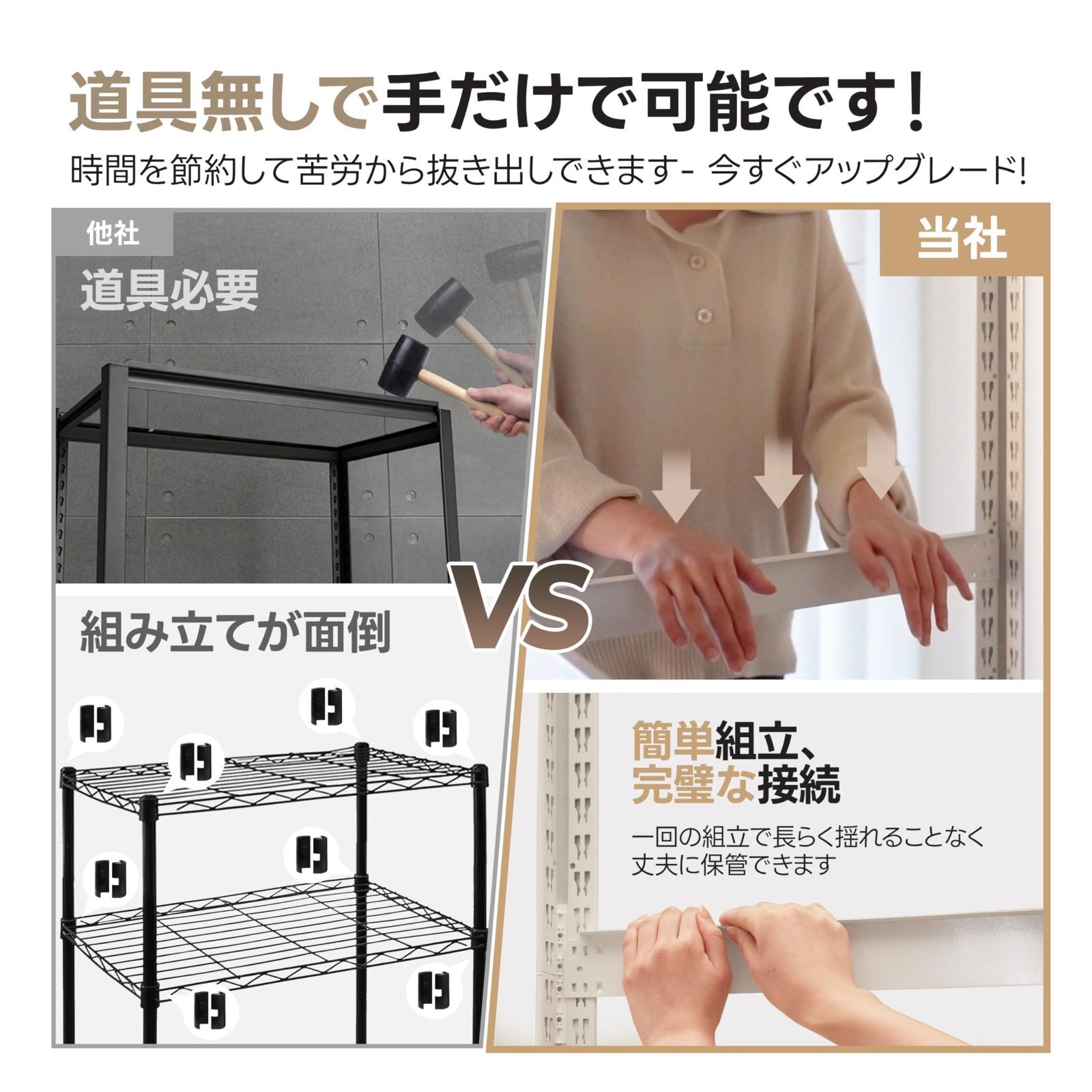 簡単組立&安全性:付属のハンマーで棚台を支柱に固定するだけのシンプルな組立、追加で組立動画を提供するので簡単に組み立てられます。 6大有害重金属のない粉体塗装適用でサビやキズに強く、16個のベースキャップがあり床を保護し安心して使用できます。