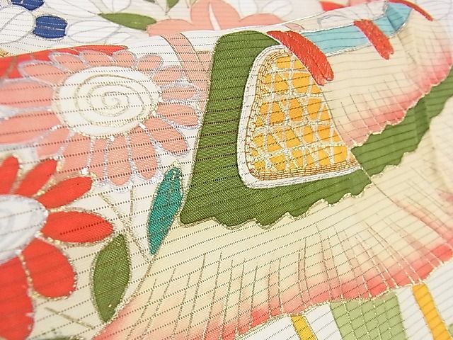 夏物 アンティーク 大正ロマン 振袖 絽 駒刺繍 渡橋風景花文 金彩 kh 4