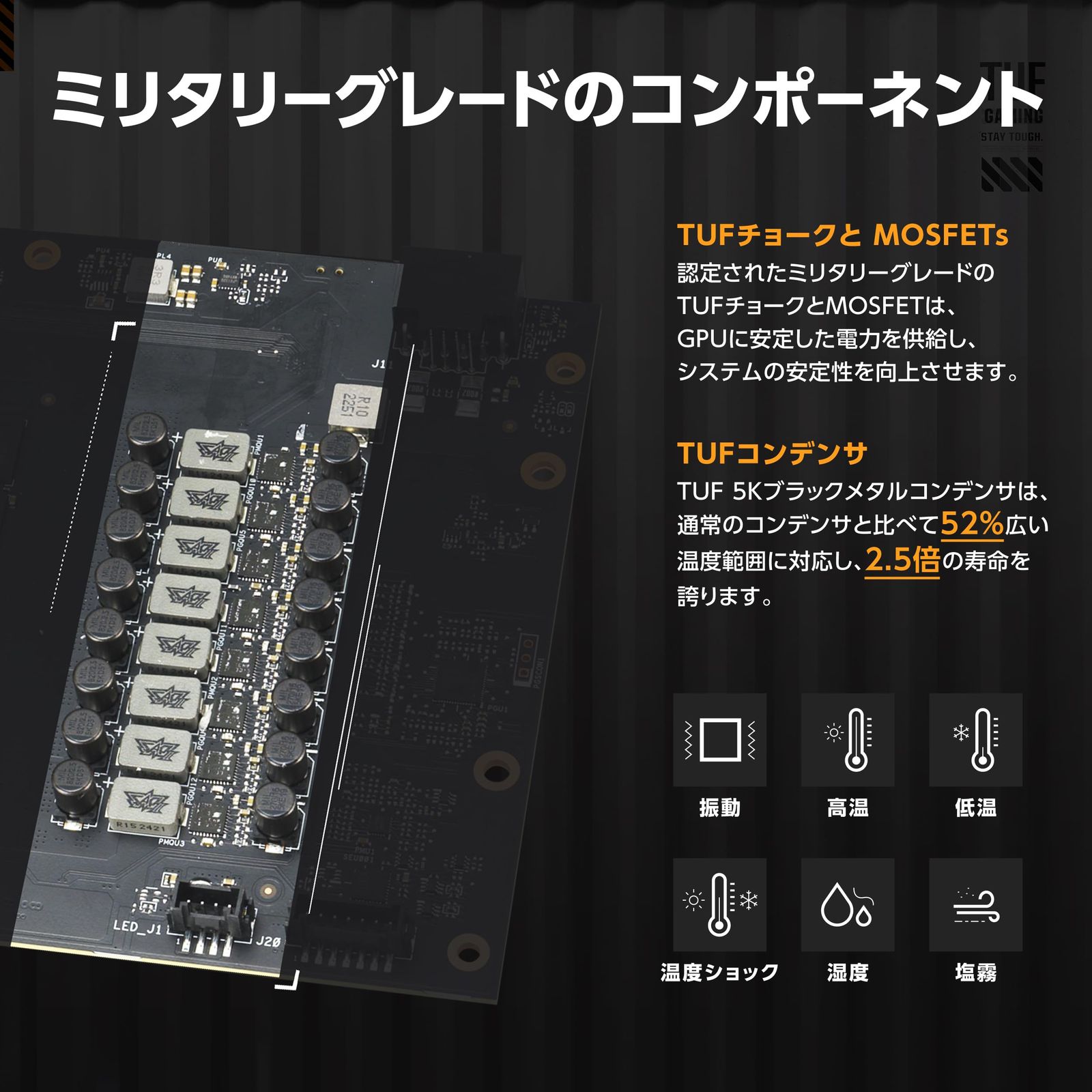 MaxContactデザイン:ASUS独自の製造プロセスで、GPUのヒートスプレッダの表面積を5%拡大。強力なヒートシンクとAxial-techファンと組み合わせることで、最大2°Cの温度改善を実現。フェーズチェンジGPUサーマルパッド:GPUとサーマルモジュールの隙間を溶けて埋めることで、優れた熱伝導性と熱放散を実現し、重負荷時でもグラフィックスカードの最適な性能と長寿命を確保。Axial-techアップグレード:Axial-techファンはデュアルボールベアリングを採用し、標準ファンより最大23%多くの風を供給。新しいファンの回転方式:外側の2つのファンは反時計回りで回転し、乱流を減少。GPU温度が50°C未満で停止、55°C以上で再起動し、性能と静音を両立。通気性のあるエクソスケルトン:高品質なダイカストシャウドとアルミ製バックプレートがPCBの曲がりを防ぎ、大型のベントで熱放散をさらに強化