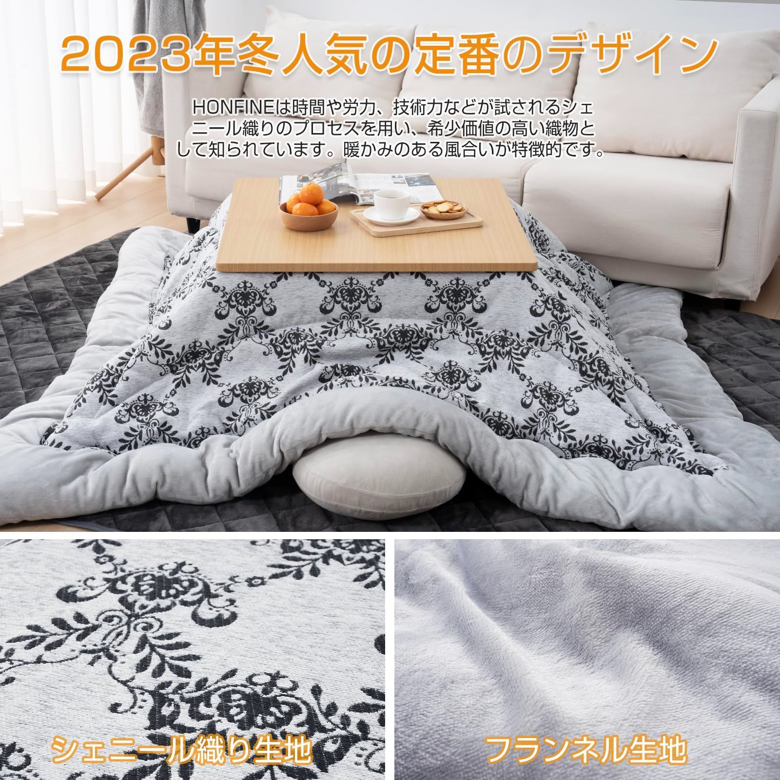【商品情報】サイズ・205x285cm(対応こたつ台:80~90×135~150cm);表地・ポリエステル90%、綿10%(シェニール織り生地で見た目がきれい);裏地・ポリエステル100%(美しい光沢感があり、手触りの良いフランネル生地);中綿・ポリエステル100%(350g/m2の詰め綿、約2.1kg)。HOMFINEのこたつ布団は2023年冬人気の定番のデザインを採用しており、立体感と高級感が出ます。※ご注意:掛け布団のみ単品販売となります。こたつ台/フランネルラグは商品に含まれません。