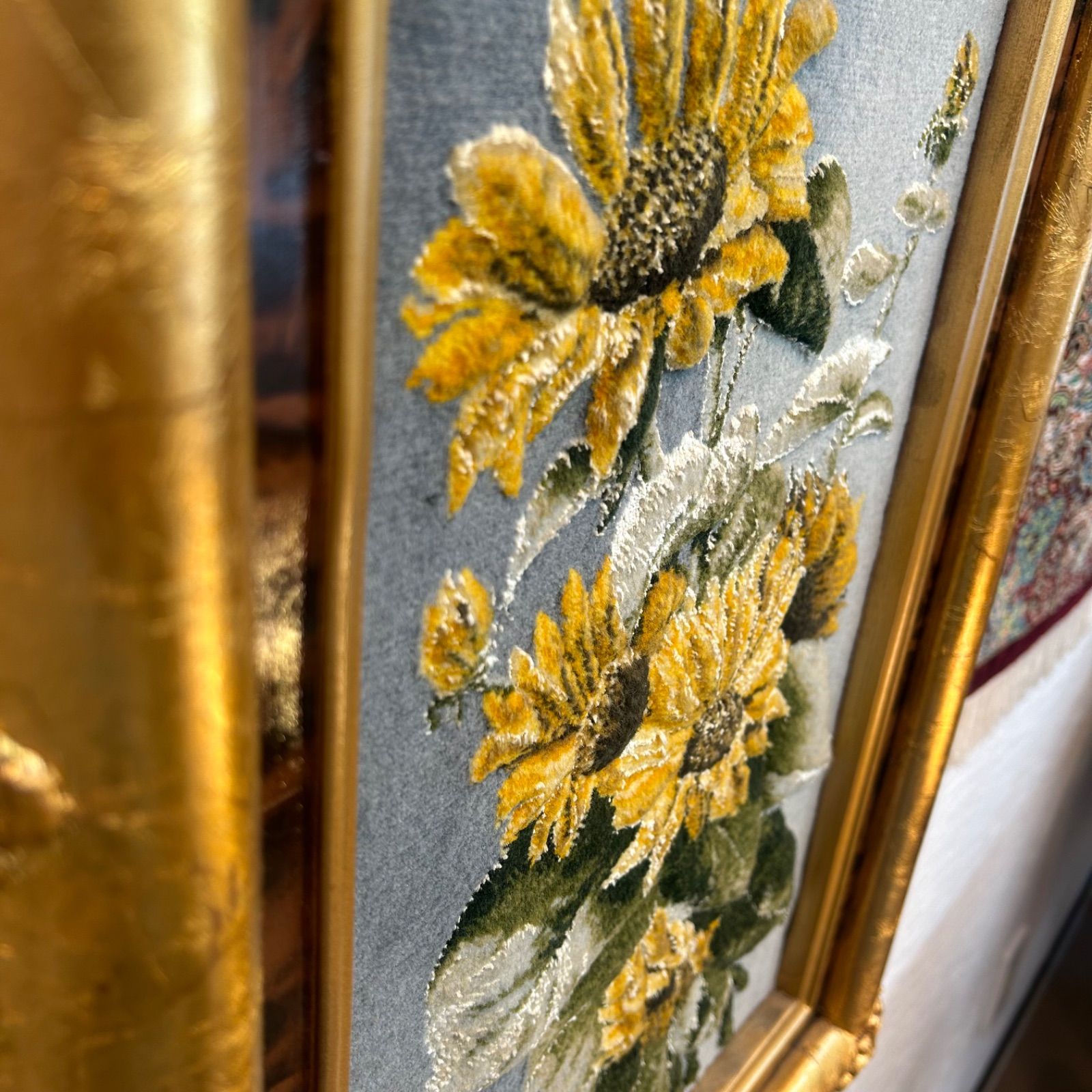 ゴールドの装飾的なフレームが、作品全体をさらに格調高く見せ、インテリア性を引き立てています。