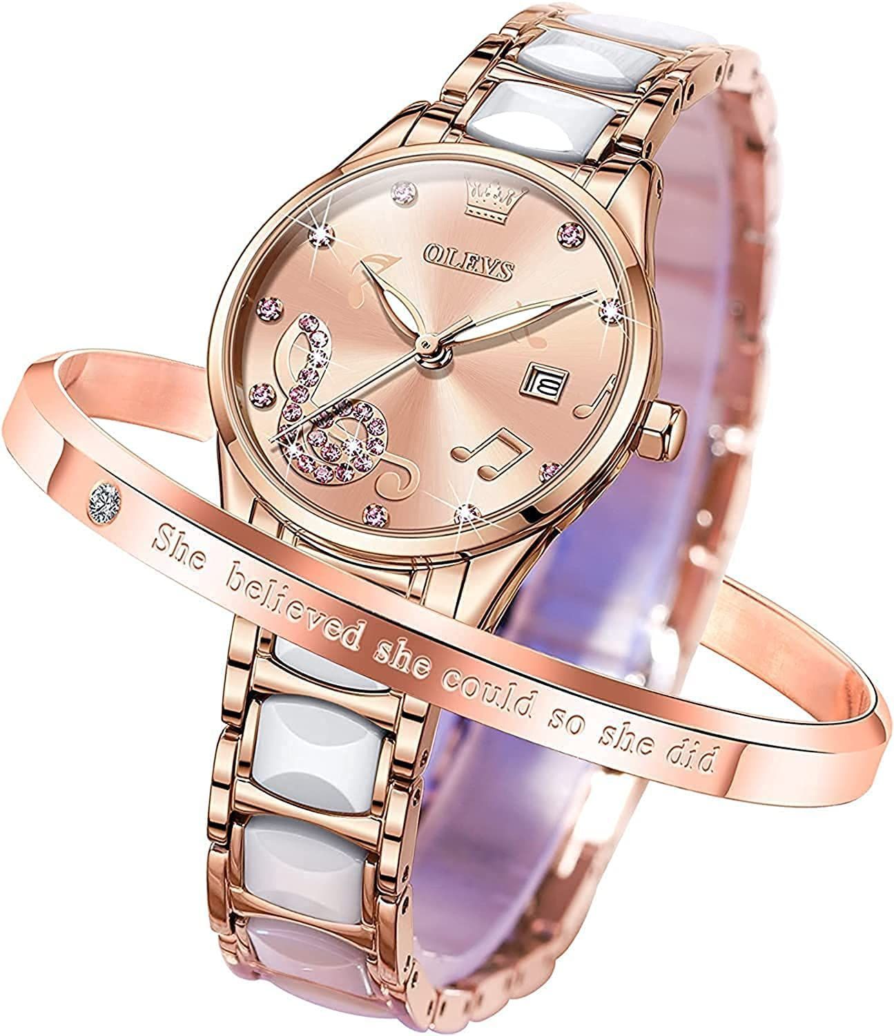 OLEVS 腕時計 レディース おしゃれ クォーツ 女性用 うで時計 日付 人気 夜光 防水 見やすい ピンク ブレスレット付き セラミック