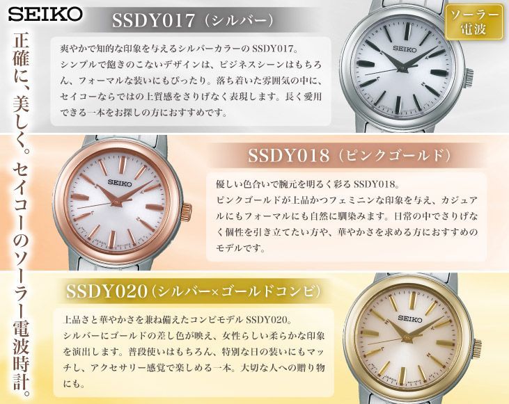 セイコーのソーラー電波時計【SSDY017/SSDY018/SSDY020】は、光で充電し、電波で常に正確な時刻を刻む、実用性に優れたモデル。電池交換や時刻合わせの手間がなく、毎日をスマートにサポートします。シンプルかつ上品なデザインは、ビジネスから日常まで幅広いシーンにマッチ。腕元にさりげない高級感を演出しながら、長く安心して使える一本です。ギフトとしてもおすすめの、セイコークオリティをぜひ体験してください。