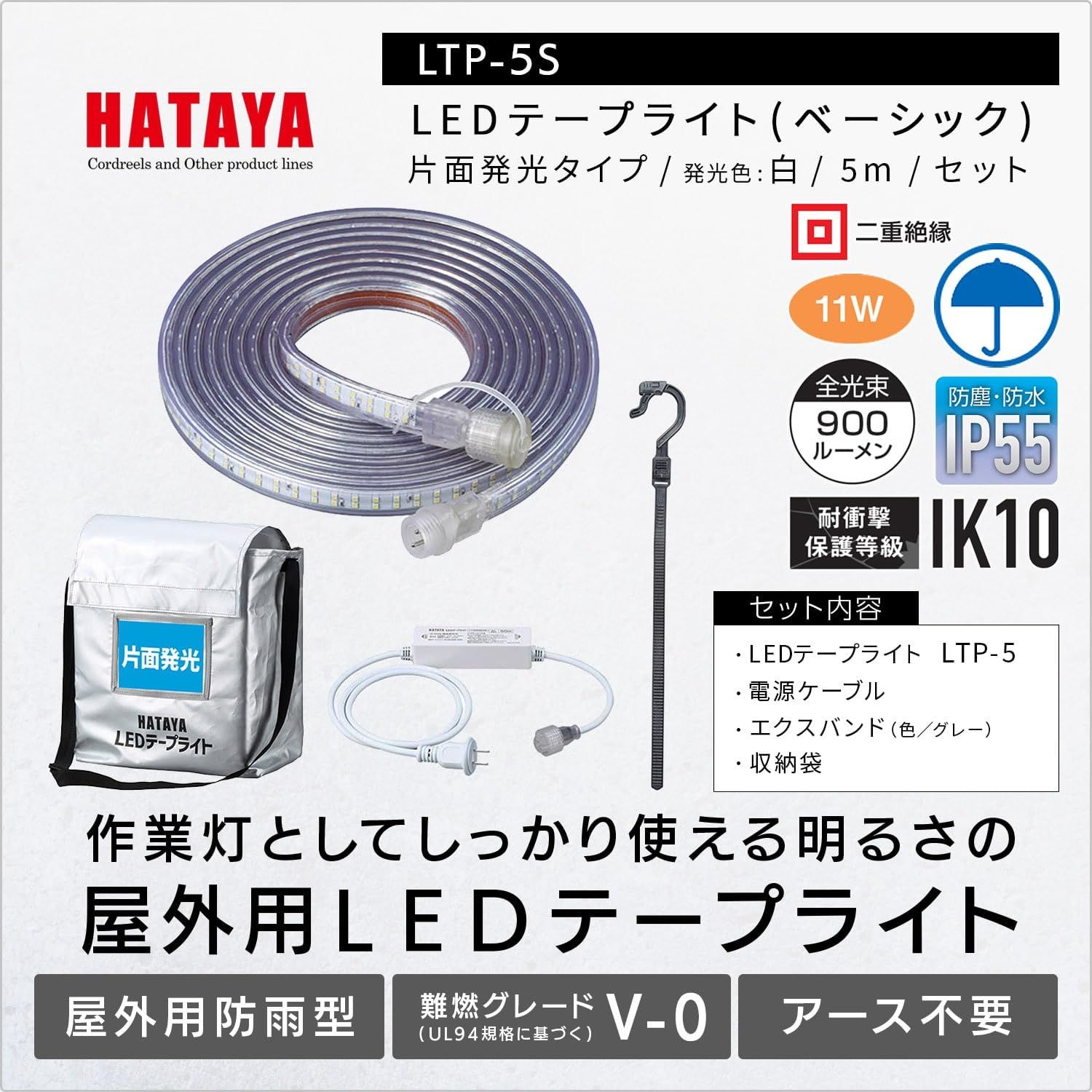 ハタヤ (HATAYA) 照明 LED 連結点灯可能 屋外用 (防雨型) IP55 防塵 防水 IK10 耐衝撃保護 全光束900Lm 長さ5m 二重絶縁 アース不要 屈曲に強い メンテナンス可能 電源ケーブル 結束用エクスバンド 収納袋 作業灯 ワークライト テープライト 家庭用 業務用 工場用 建設現場 LEDテープライト (片面発光タイプ) LTP-5S セット