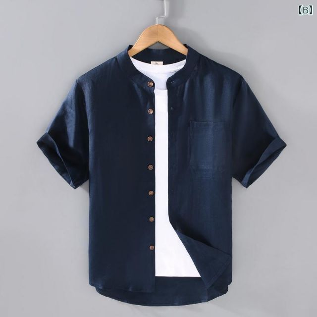 - XL メンズ ファッション 服 男性用 オシャレ シンプル 大人 かっこいい 大きいサイズ ストリート 紳士服 ライト リネン スタンド 半袖 シャツ 夏 通気性 フル リネンシャツ