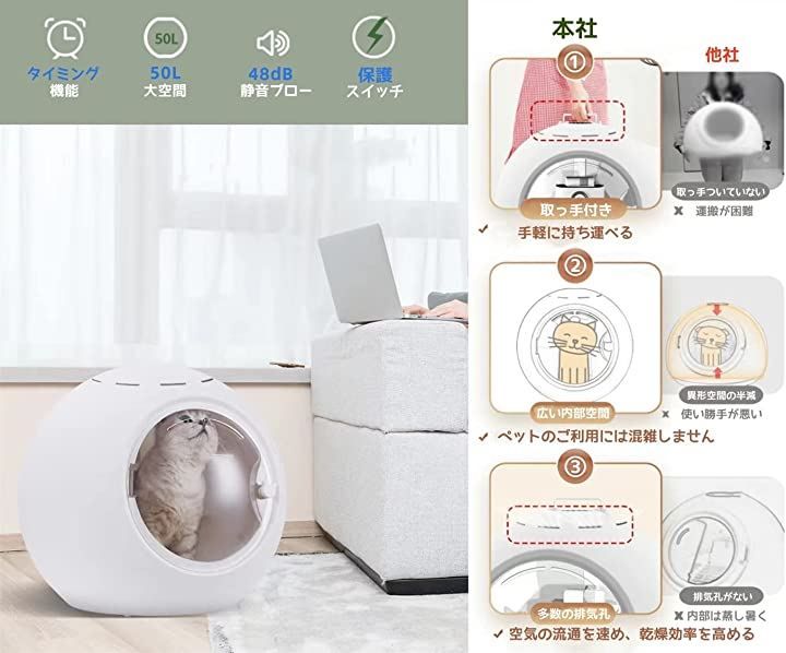 ・「一台多役」猫乾燥機としてだけではなく、殺菌機能:ペットのおもちゃや衣類の消毒や乾燥に使える;照明機能:ボクス全体を照らして、ペットが安心していられるようにします。