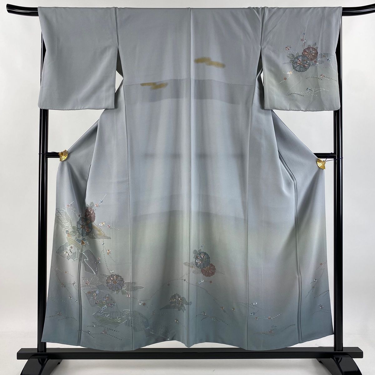 訪問着 身丈155.5 cm 裄丈65.5 M 袷 菊 扇面 刺繍 金糸 青灰色 正絹 秀品