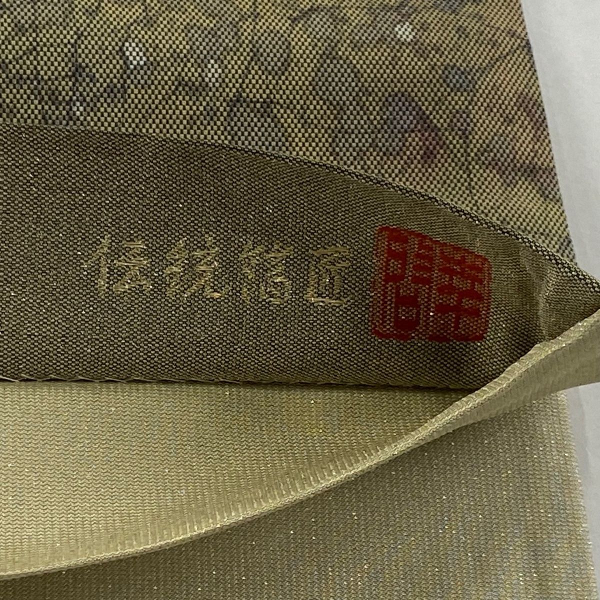袋帯 落款 伝統箔匠 外 き 幾何学模様 螺鈿 箔 茶緑色 お太鼓柄 正絹