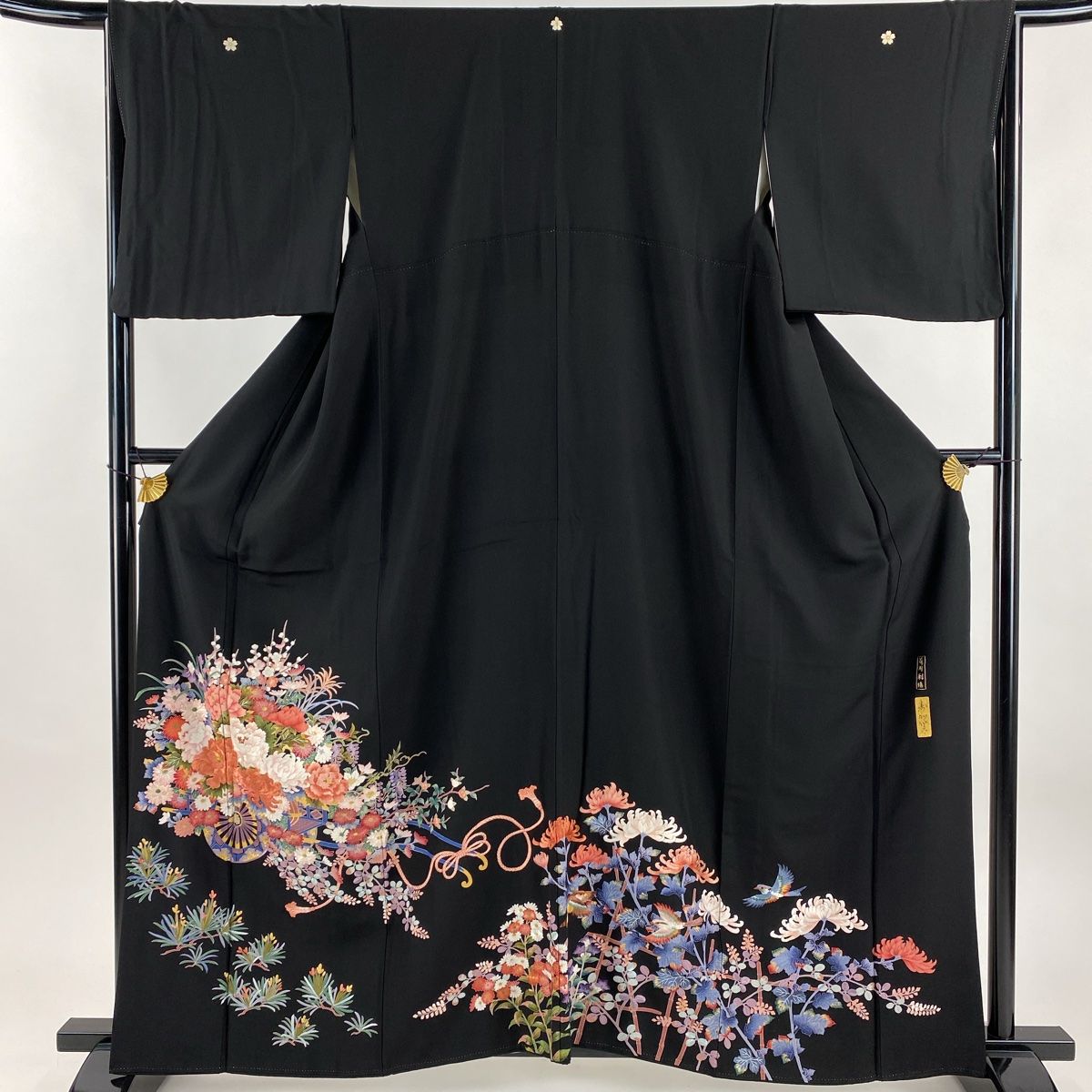 黒留袖 身丈161 cm 裄丈66.5 M 袷 落款 花車 鳥 蘇州刺繍 黒 正絹