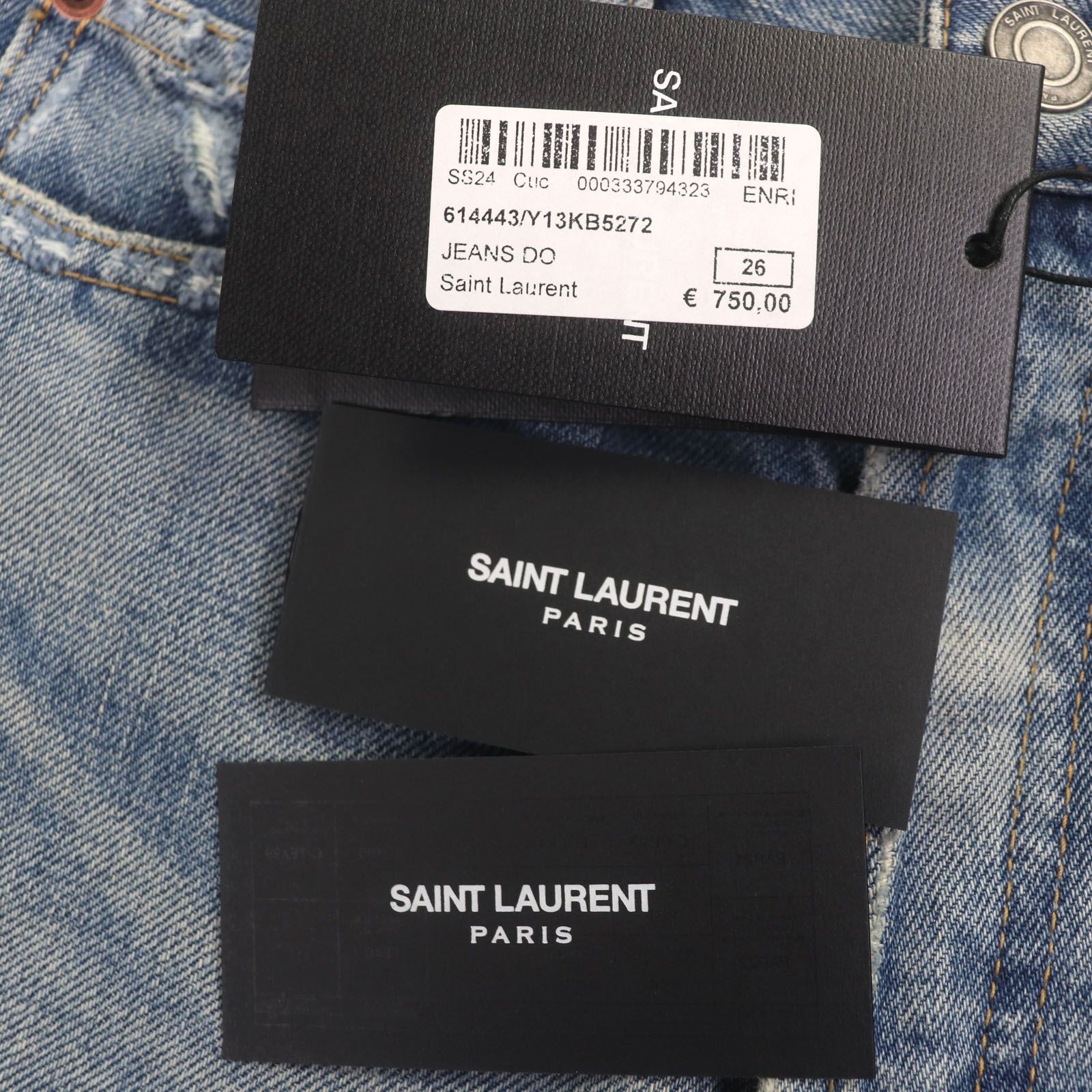 SAINT LAURENT PARIS サンローランパリ 24 SS 614443 ウォッシュ加工 ボタンフライ レザーパッチ付き ストレート デニムパンツ アイスブルー 26 レディース
